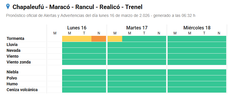 El alerta afecta a varias provincias. En el caso de La Pampa, abarca el centro y norte. En nuetra zona contempla a los departamentos Chapaleufú, Marac, Rancul, Realicó y Trenel.