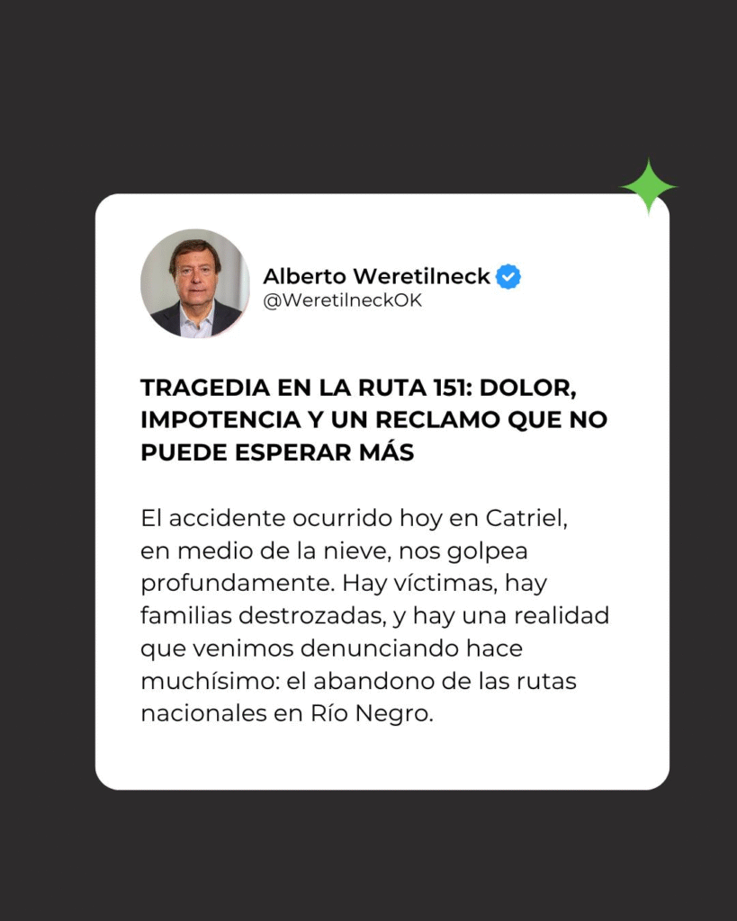 “Hay dolor, impotencia y un reclamo que no puede esperar más”, expresó Weretilneck en sus redes sociales, tras conocerse la noticia del fatal choque.