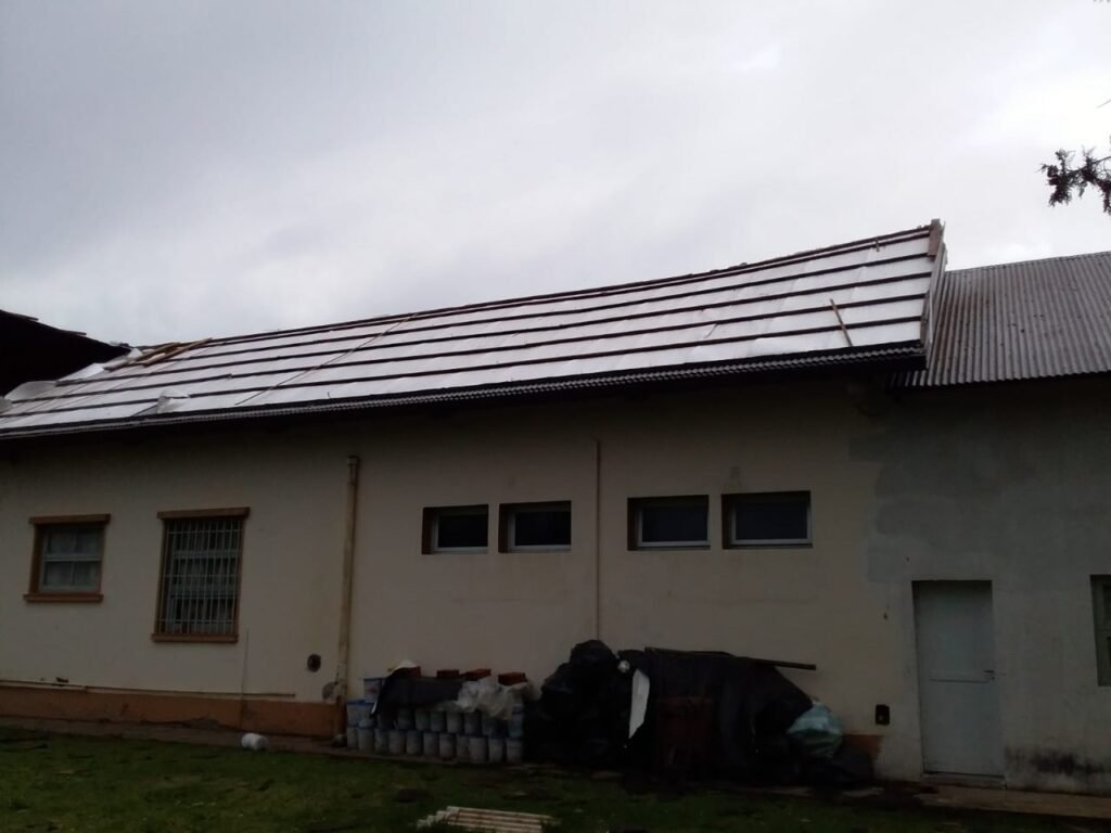 Nuestro colega detalló que más allá de los daños en el techo de la escuela, no se observan otras anomalías en la institución, «sí caída de plantas y ramas en distintos sectores del casco urbano».