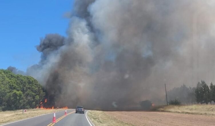 Un incendio forestal declarado este mediodía a la vera de la Ruta Provincial 101 puso en alerta a las autoridades y automovilistas. El fuego afectó una plantación de pinos en las inmediaciones de Speluzzi, específicamente en la curva situada antes de llegar al frigorífico de la zona.