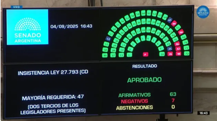 En una nueva sesión adversa para la Casa Rosada, un conglomerado de kirchneristas, radicales, macristas y partidos provinciales le aplicaron este jueves a la tarde otro duro golpe al Gobierno libertario: la oposición desactivó un reciente veto del Ejecutivo -primera vez en más de 20 años- y reanudó la ley que declara la emergencia en discapacidad. La decisión, que obtuvo con holgura los dos tercios, recibió 63 votos a favor y siete en contra.