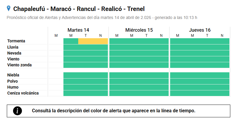 El Servicio Meteorológico Nacional emitió un alerta de nivel amarillo para la tarde y noche de este martes en el sector este de La Pampa.