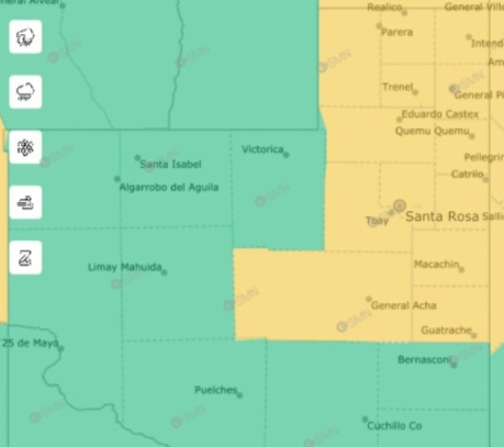 La advertencia alcanza al norte, centro y este de la provincia. Los departamentos afectados son Chapaleufú, Maracó, Rancul, Realicó, Trenel, Atreucó, Capital, Catriló, Conhelo, Guatraché, Quemú Quemú, Toay y Utracán, donde se prevé que los fenómenos se desarrollen entre la tarde del viernes y la del sábado.