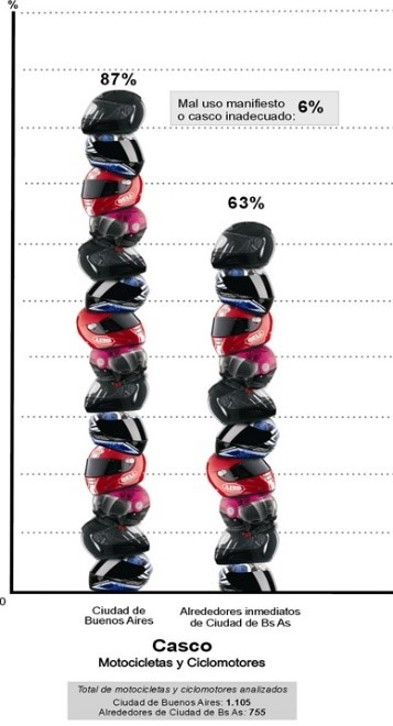En CABA, lo utiliza un 87% de los motociclistas mientras que un 63% lo hace en los municipios del GBA, lo que significa un 38% más en la primera. No se registraron diferencias significativas de uso entre los diferentes distritos del GBA observados. La diferencia de uso de cascos y cinturones con la Ciudad de Buenos Aires, debería llamar la atención de las autoridades de la provincia a cargo de la seguridad vial. Puede observarse que las tareas de fiscalización del tránsito en general y del uso de casco en particular resultan insuficientes para lograr la adhesión generalizada de los motociclistas a su uso. Se destaca que la medida de no expender combustible a los motociclistas sin casco, que rige en la provincia de Buenos Aires, no parece ejercer efecto como incentivo para su uso.