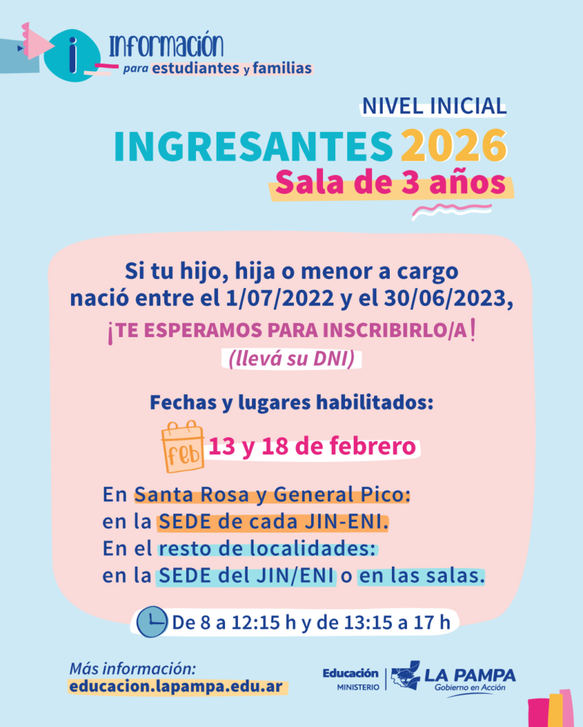 El Ministerio de Educación de La Pampa, a través de la Dirección General de Educación Inicial, comunicó que los días 13 y 18 de febrero se realizarán las inscripciones correspondientes para ingresantes a salas de tres años en 2026.