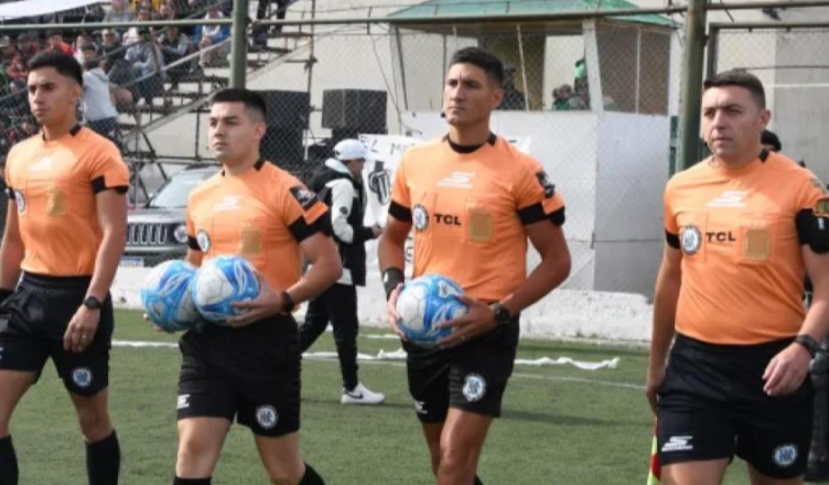 De izquierda a derecha: Yasu Muñoz (asistente N° 2), Emanuel Leguizamón (cuarto árbitro, con las dos pelotas), Cristian Rubiano (árbitro principal) y Diego Pereyra (asistente N° 1) en la «Pichón Guatti» de Río Gallegos.