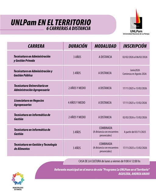 De acuerdo a lo informado, la Referente municipal será Andrea Anahí Aguilera, quien atenderá consultas en la Casa de la Cultura de lunes a viernes de 9 a 12 horas, y guiará e el proceso de inscripción a jóvenes y adultos que opten por algunas de estas carreras.