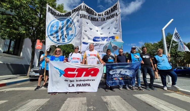 Este martes se desarrolló una concentración en plaza San Martín con una marcha posterior hasta Casa de Gobierno, en Santa Rosa, para reclamarle al gobierno una respuesta urgente que incluya el pago de una suma compensadora, la apertura de ambas paritarias y una recomposición real de los salarios.
