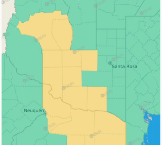 El alerta contempla tormentas fuertes en las provincias de Mendoza, La Pampa, Río Negro, y Chubut.