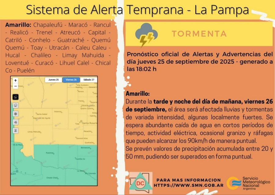 El alerta emitido este jueves a las 18.02 horas, cubre a los departamentos Chapaleufú, Maracó, Rancul, Realicó, Trenel, Atreucó, Capital, Catriló, Conhelo,  Guatraché, Quemú Quemú, Toay, Utracán, Caleu Caleu, Hucal, Chalileo, Limay Mahuida, Loventué, Curacó, Lihuel Calel, Chical Co y Puelén.