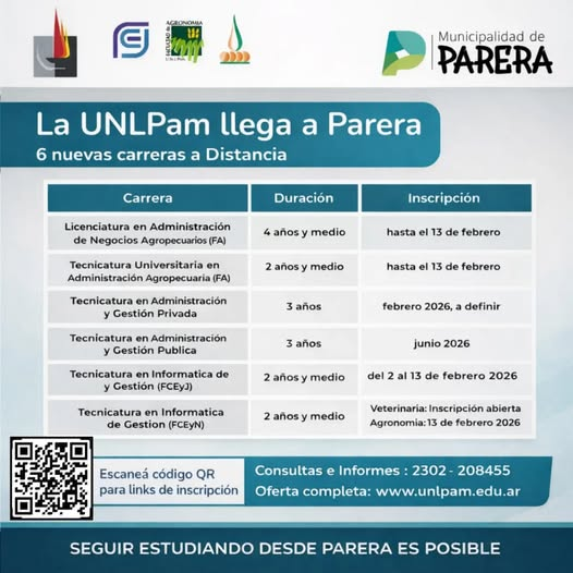 El Municipio de Parera, firmó el convenio que permitirá que la localidad sea parte del programa “La UNLPam en el Territorio”, acercando seis carreras universitarias que se pueden realizar a distancia.