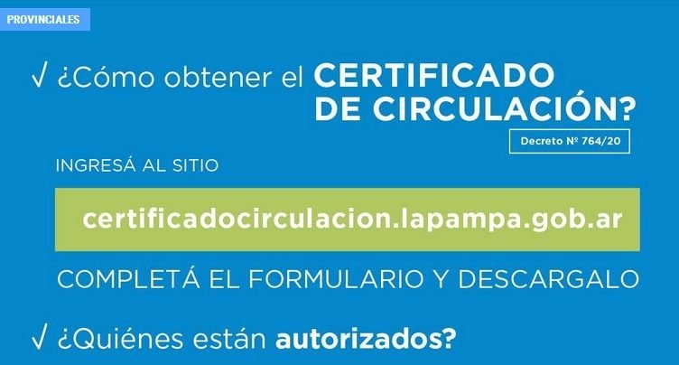 El Ministerio de Conectividad y Modernización informó que el sitio web http://certificadocirculacion.lapampa.gob.ar/ para tramitar los permisos de circulación estará disponible a partir de las 00hs del viernes 1 de mayo.