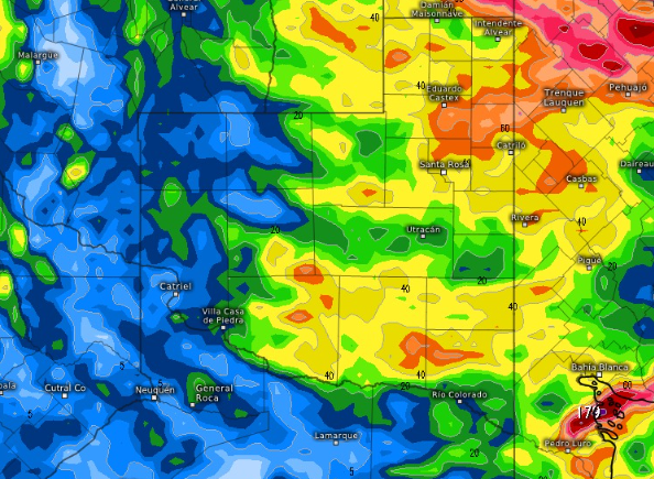 Baraldi pronosticó que en los próximos 7 días, zonas del noreste de La Pampa pueden recibir hasta 100 mm con puntuales de 150mm. El centro y sureste de La Pampa puede recibir hasta 70mm con puntales de 100mm, mientras que el oeste y suroeste de La Pampa puede recibir hasta 30 mm con puntuales de 50mm.
